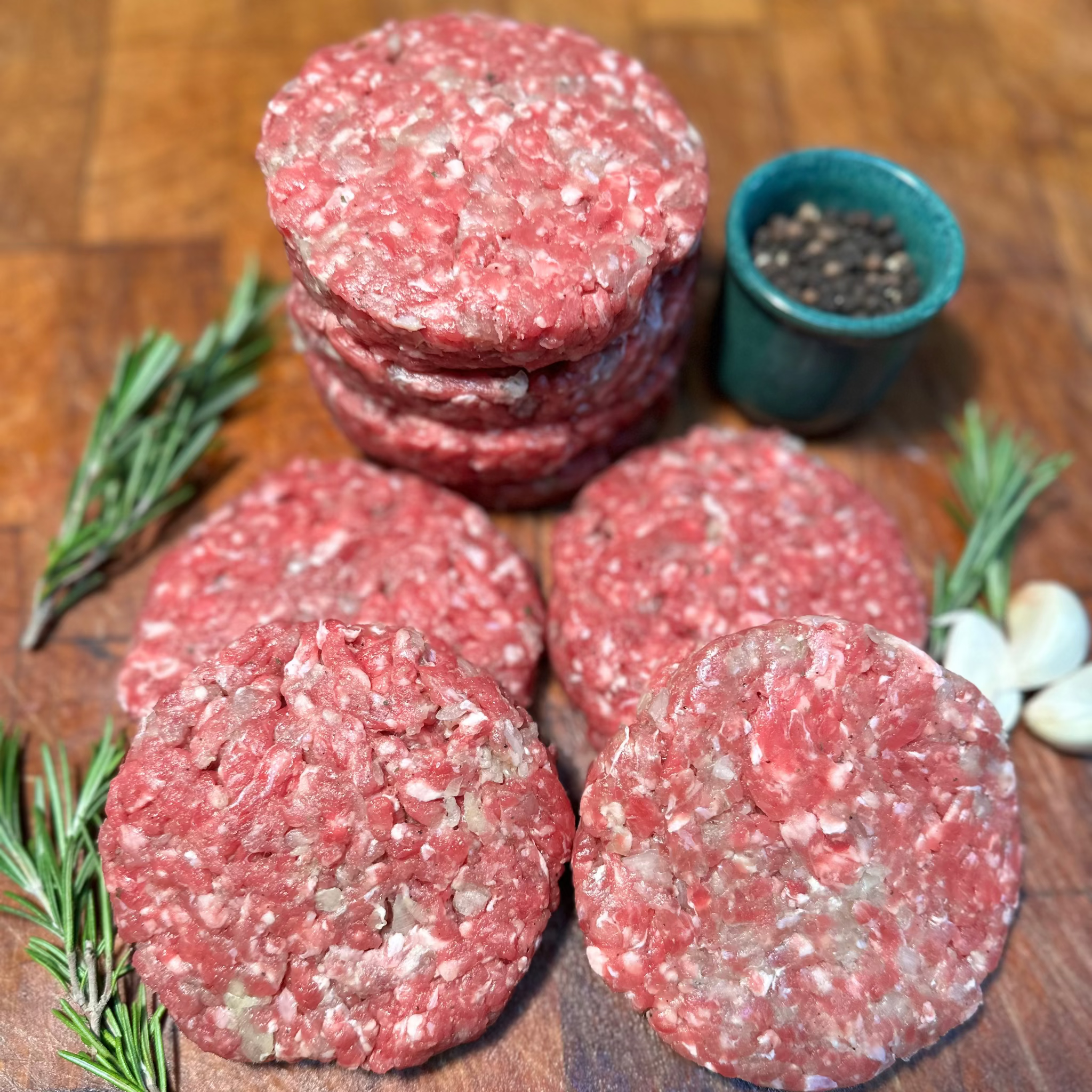 Gluten-free beef burgers. Home-made recipe with salt, pepper, onion, garlic, mustard and parsley. No artificial colours, flavourings or preservatives. Packs of 4.